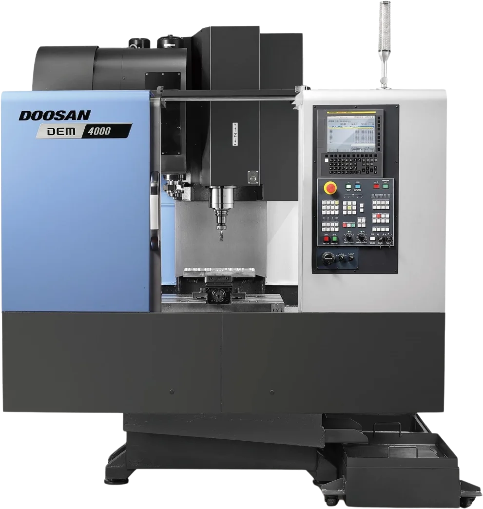 The DEM series includes the Doosan DEM 4000, a compact, high-performance vertical machining center.