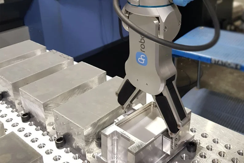 Once machining operations have been completed the cobot takes the finished (machined) component from the machine and places it back on the peg board in its predetermined position. This cycle is then repeated, with no operator intervention, until all the parts have been machined.